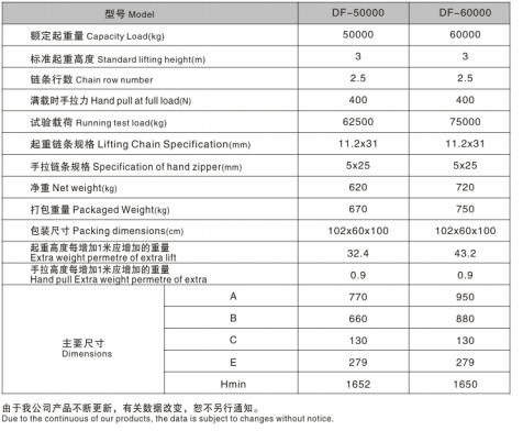簡(jiǎn)介—— 全新設計50T手拉葫蘆,本葫蘆由兩個(gè)葫蘆同時(shí)操作,提高了工作效率,提升了速度提高了一倍